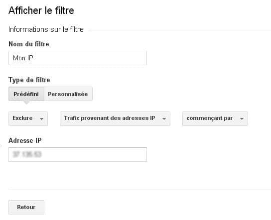 - Cliquez sur Filtre prédéfini, puis sur Exclure et inscrivez votre adresse IP.